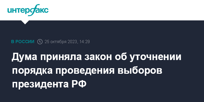 Москва. 25 октября. INTERFAX.RU - Госдума на заседании в среду приняла в третьем, окончательном чтении закон, уточняющий порядок проведения выборов президента России.