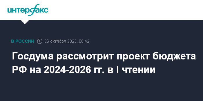 Москва. 26 октября. INTERFAX.RU - Госдума на заседании в четверг планирует рассмотреть в первом чтении проект федерального бюджета РФ на 2024-2026 гг., а также проекты трехлетних бюджетов ФОМС и Социального фонда, следует из повестки заседаний парламента.