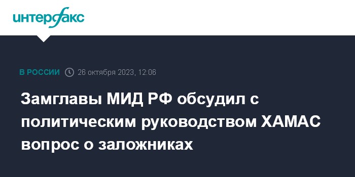 Москва. 26 октября. INTERFAX.RU - Замглавы МИД РФ, спецпредставитель президента России по Ближнему Востоку Михаил Богданов сообщил, что в ходе недавнего визита в Катар обсуждал с политическим руководством ХАМАС вопрос освобождения заложников.