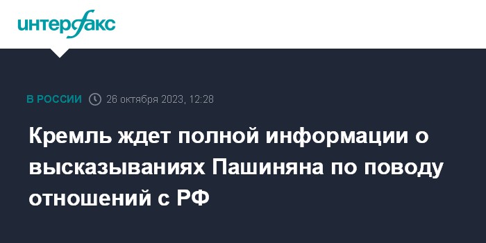 Москва. 26 октября. INTERFAX.RU - В Кремле рассчитывают получить полную информацию от Еревана в связи с высказываниями премьер-министра Армении Никола Пашиняна, опубликованными в издании The Wall Street Journal.