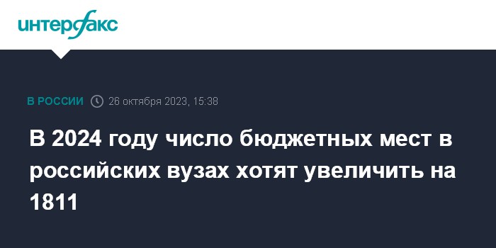Москва. 26 октября. INTERFAX.RU - Количество бюджетных мест в российских вузах планируется увеличить на более чем 1,8 тысячи мест в 2024 году, их общий объем составит почти 592 тысячи, сообщил через пресс-службу вице-премьер Дмитрий Чернышенко.