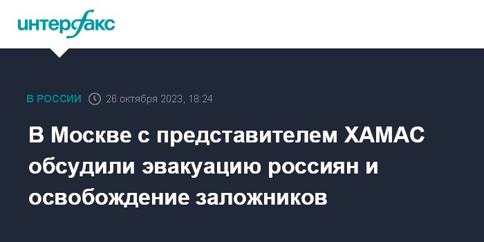 Москва. 26 октября. INTERFAX.RU - Российская сторона обсудила с находящимся в Москве представителем движения ХАМАС освобождение находящихся в секторе Газа заложников, эвакуацию россиян и других иностранных граждан, сообщили журналистам в российском МИД.