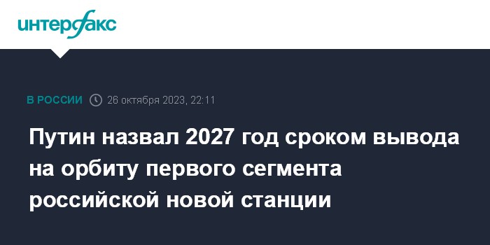 Москва. 26 октября. INTERFAX.RU - Президент Владимир Путин сообщил, что первый сегмент новой российской орбитальной станции будет выведен в космос в 2027 году. Он сказал об этом на встрече с молодыми учеными и специалистами космической отрасли.