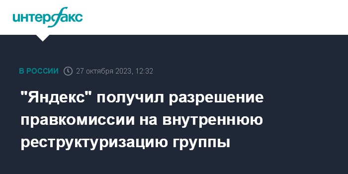 Москва. 27 октября. INTERFAX.RU - "Яндекс" сообщил о получении одного из необходимых разрешений на осуществление сделки по разделению бизнеса: правкомиссия по иностранным инвестициям в РФ одобрила внутреннюю реструктуризацию группы.