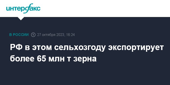 Москва. 27 октября. INTERFAX.RU - Россия в этом сельхозгоду (июль 2023-июнь 2024 гг.) экспортирует более 65 млн тонн зерна, сообщил министр сельского хозяйства РФ Дмитрий Патрушев на заседании правительства в пятницу.