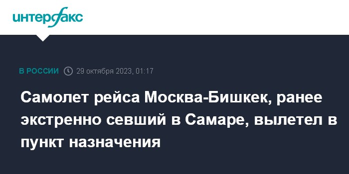 Москва. 29 октября. INTERFAX.RU - Самолет авиакомпании Avia Traffic Company (Киргизия), летевший из Москвы в Бишкек и экстренно приземлившийся в аэропорту Самары, вылетел в пункт назначения, сообщает Приволжская транспортная прокуратура в воскресенье.