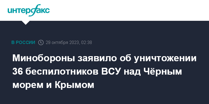 Москва. 29 октября. INTERFAX.RU - Российские военные заявили, что в ночь на воскресенье средства противовоздушной обороны сбили 36 украинских беспилотников самолётного типа над Чёрным морем и северо-западной частью Крыма.
