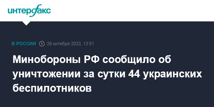 Москва. 29 октября. INTERFAX.RU - Российские военные заявили, что за сутки уничтожили 44 украинских беспилотника.