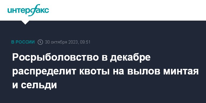 Москва. 30 октября. INTERFAX.RU - Росрыболовство планирует в декабре распределить инвестиционные квоты на вылов минтая и сельди.