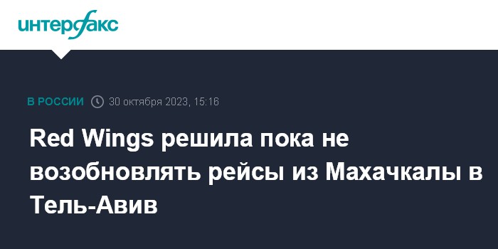 Москва. 30 октября. INTERFAX.RU - Red Wings со вторника возобновляет рейсы в Махачкалу, исключение составят рейсы в Тель-Авив, сообщил "Интерфаксу" представитель компании.