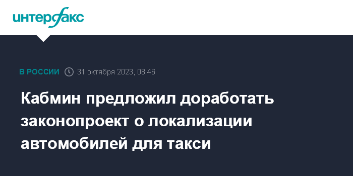 Москва. 31 октября. INTERFAX.RU - Правительство РФ готово поддержать законопроект сенатора Андрея Кутепова об установлении требований к локализации автомобилей, используемых в качестве легковых такси, при условии его доработки, следует из проекта отзыва, с которым ознакомился "Интерфакс".