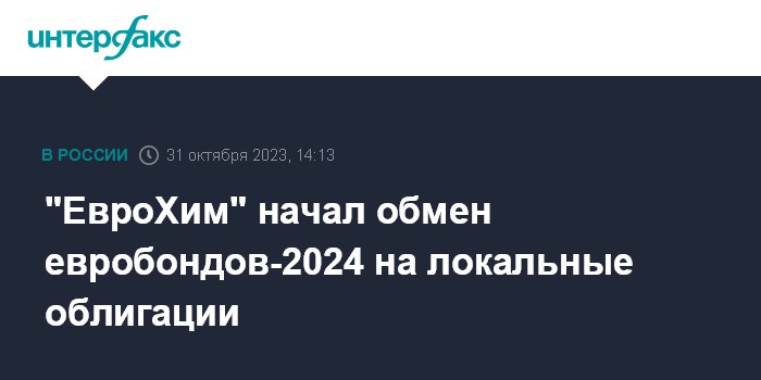 Москва. 31 октября. INTERFAX.RU - "ЕвроХим" начал обмен еврооблигаций с погашением в 2024 году, права на которые учитываются российскими депозитариями, на локальные облигации.
