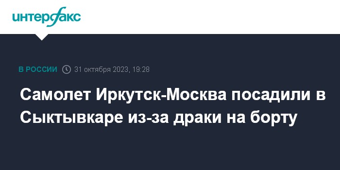 Москва. 31 октября. INTERFAX.RU - Пассажирский самолет, летевший из Иркутска в Москву, вынужденно сел в Сыктывкаре из-за драки двух пассажиров, сообщает "МВД Медиа" со ссылкой на пресс-центр МВД и представителя ведомства Ирину Волк.