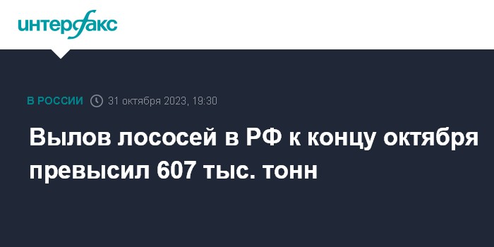 Москва. 31 октября. INTERFAX.RU - Российские рыбаки к 31 октября выловили более 607 тысяч тонн лососей, что на 13% больше, чем на аналогичную дату 2021 года (выловы лососей сравниваются между четными и между нечетными годами), сообщает Росрыболовство.