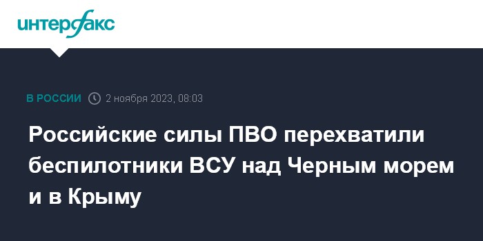 Москва. 2 ноября. INTERFAX.RU - Российские военные в четверг сообщили об уничтожении украинского беспилотника над акваторией Черного моря и еще пяти дронов над территорией Крыма.