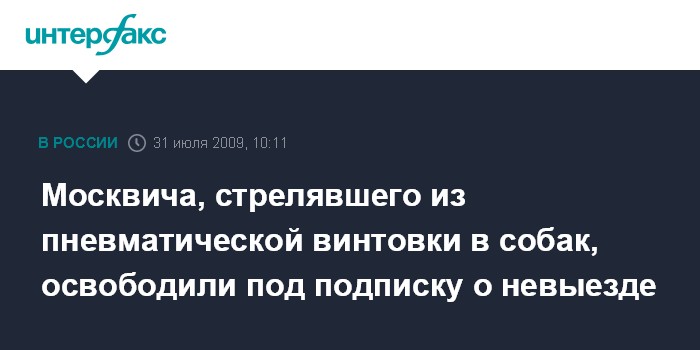 Москва. 31 июля. INTERFAX.RU - Московская милиция подтвердила задержание мужчины, стрелявшего из пневматической винтовки по собакам, ему предъявлено обвинение в совершении преступления.
