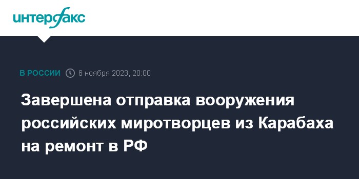 Москва. 6 ноября. INTERFAX.RU - Российские военные сообщили, что завершена отправка вооружения российского миротворческого контингента из Карабаха в РФ на ремонт.
