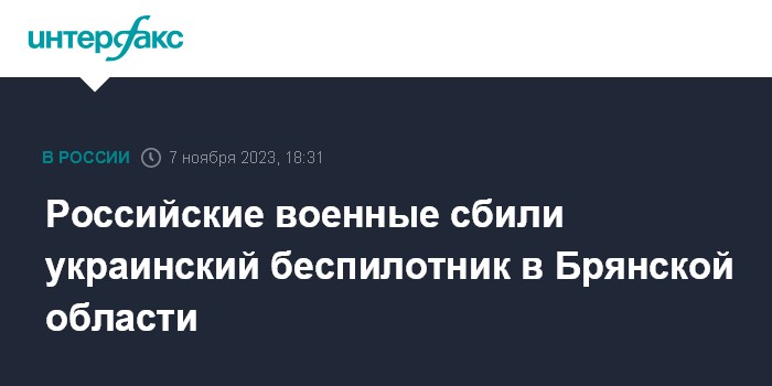 Москва. 7 ноября. INTERFAX.RU - Министерство обороны России сообщило, что противовоздушная оборона около 17:00 уничтожила украинский дрон самолетного типа над Брянской областью.