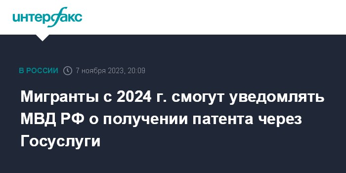 Мигранты с 2024 г. смогут уведомлять МВД РФ о получении патента через Госуслуги