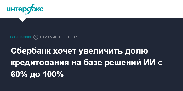 Сбербанк хочет увеличить долю кредитования на базе решений ИИ с 60% до 100%