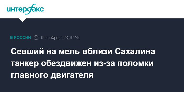 Севший на мель вблизи Сахалина танкер обездвижен из-за поломки главного двигателя