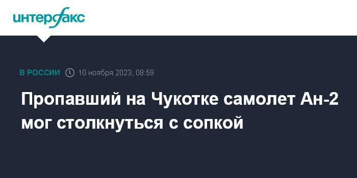 Москва. 10 ноября. INTERFAX.RU - Самолет Ан-2, пропавший на Чукотке, мог столкнуться с сопкой во время посадки в сложных метеоусловиях, сообщили "Интерфаксу" в экстренных службах.