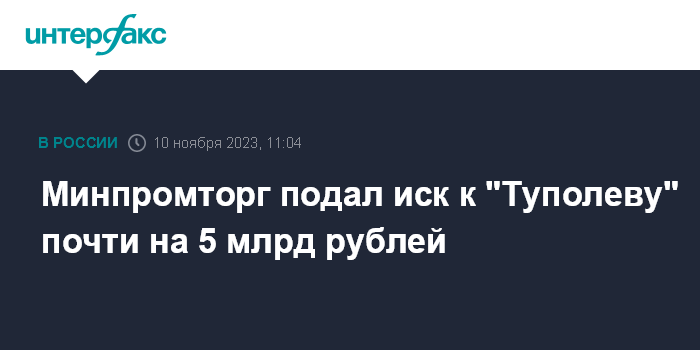Москва. 10 ноября. INTERFAX.RU - Минпромторг подал в Арбитражный суд Москвы иск к АО "Туполев" на 4,98 млрд рублей, сказано на сайте судебной картотеки. Материалы, поясняющие суть исковых претензий, не опубликованы.