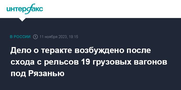 Москва. 11 ноября. INTERFAX.RU - Крушение грузового состава на железной дороге под Рязанью будет расследоваться по статье о теракте, сообщил в субботу телеграм-канал Следственного комитета РФ (СКР).