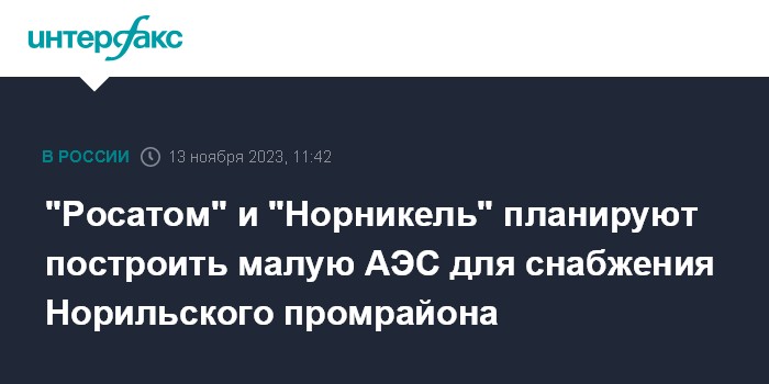 Москва. 13 ноября. INTERFAX.RU - ГК "Росатом" и ПАО "Норильский никель" изучат возможные варианты, определят приоритетную площадку размещения и конфигурацию наземной АЭС малой мощности для энергоснабжения Норильского промышленного района (НПР), сообщил "Росатом" по итогам подписания соответствующего соглашения.