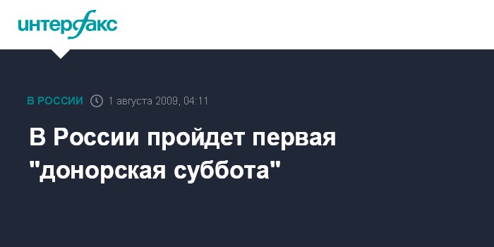 "1 августа 2009 года, впервые в выходной день, на всей территории Российской Федерации откроются для приема безвозмездных доноров учреждения "Службы крови". Эта дата выбрана для проведения первой "Субботы доноров" не случайно - именно в летний период острее ощущается нехватка донорской крови", - отмечают в министерстве. Необходимость проведения таких мероприятий в Минздравсоцразвития объясняют тем, что в России много детей и взрослых, которые нуждаются в переливании крови и ее компонентов.
