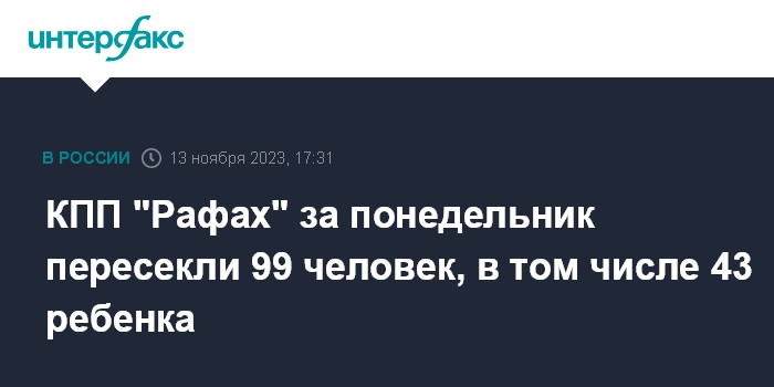 КПП "Рафах" за понедельник пересекли 99 человек, в том числе 43 ребенка