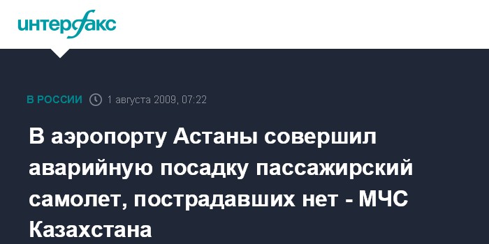 Астана. 1 августа. ИНТЕРФАКС-КАЗАХСТАН - В аэропорту Астаны совершил аварийную посадку пассажирский самолет авиакомпании "Эйр Астана", выполнявший рейс сообщением Алма-Ата - Павлодар (адмцентр Павлодарской области), сообщили "Интерфаксу" в субботу в МЧС Казахстана.