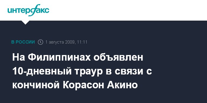 Лондон. 1 августа. INTERFAX.RU - Президент Филиппин Глория Арройо объявила десятидневный национальный траур в связи с кончиной экс-президента страны Корасон Акино.