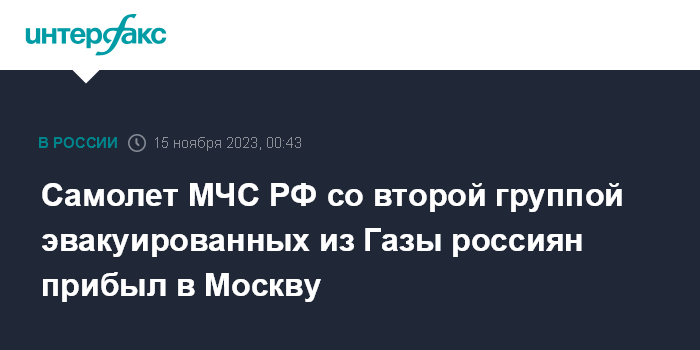 Москва. 15 ноября. INTERFAX.RU - Самолет МЧС РФ, на борту которого находятся 98 эвакуированных из сектора Газа россиян, приземлился в аэропорту "Домодедово", сообщил директор департамента информационной политики МЧС РФ Роман Охотенко.