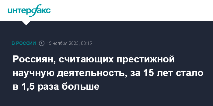 Москва. 15 ноября. INTERFAX.RU - Почти две трети россиян (63%) считают, что в настоящее время в России престижно быть ученым и заниматься научной деятельностью, тогда как в 2008 году такого мнения придерживались 42% сограждан, свидетельствуют данные опроса Фонда "Общественное мнение" (ФОМ), опубликованные на сайте социологического центра.