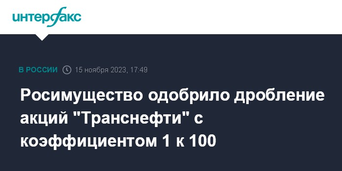 Москва. 15 ноября. INTERFAX.RU - Росимущество одобрило дробление акций "Транснефти" в 100 раз, сообщила компания.