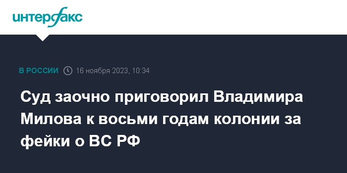 Москва. 16 ноября. INTERFAX.RU - Басманный суд Москвы заочно назначил оппозиционеру Владимиру Милову (признан в РФ иноагентом) восемь лет колонии общего режима по делу о распространении ложной информации о Вооруженных силах РФ, сообщили "Интерфаксу" в суде в четверг.