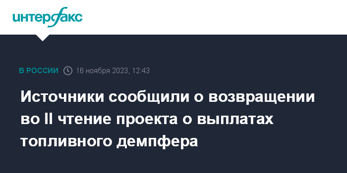 Москва. 16 ноября. INTERFAX.RU - Принятый во втором чтении законопроект (№ 448566-8) о возврате выплат по топливному демпферу и налоговым изменениям, которые должны компенсировать бюджету увеличивающиеся расходы, направляется снова во второе чтение - т.е. документ будет пересмотрен, сообщил "Интерфаксу" источник, знакомый с ситуацией.