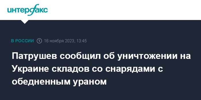 Москва. 16 ноября. INTERFAX.RU - Уничтожены склады со снарядами с обедненным ураном, которые были поставлены Украине, заявил секретарь Совбеза РФ Николай Патрушев.