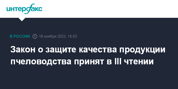 Москва. 16 ноября. INTERFAX.RU - Депутаты Госдумы приняли в третьем чтении закон о понятии "продукция пчеловодства".