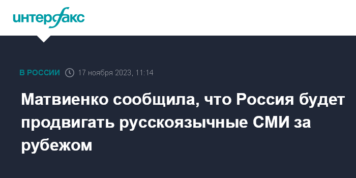 Москва. 17 ноября. INTERFAX.RU - Россия продолжит поддержку русскоязычных СМИ за рубежом, заявила в пятницу председатель Совета Федерации Валентина Матвиенко.
