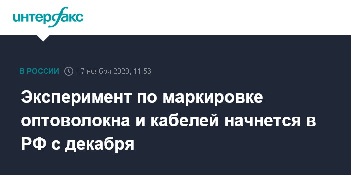 Москва. 17 ноября. INTERFAX.RU - Эксперимент по маркировке средствами идентификации через систему "Честный знак" отдельных видов оптоволоконной продукции пройдет в России с 1 декабря 2023 года по 1 декабря 2024 года. Соответствующее постановление утверждено правительством РФ.