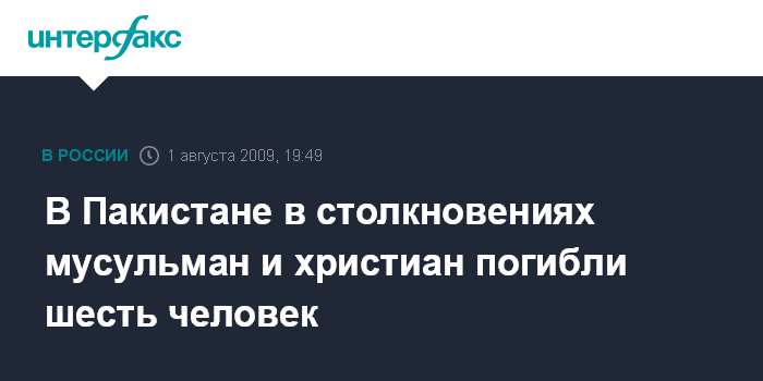 Лондон. 1 августа. ИНТЕРФАКС - В Пакистане шесть христиан погибли в горящем доме, когда произошли столкновения и перестрелки между мусульманской и христианской общинами, сообщает в субботу британская телерадиокорпорация Би-Би-Си.