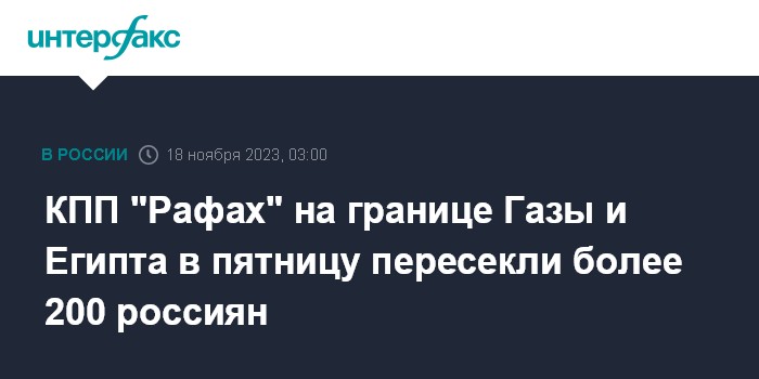 Москва. 18 ноября. INTERFAX.RU - Свыше 200 российских граждан пересекли контрольно-пропускной пункт (КПП) "Рафах" на границе с Египтом и сектором Газа в пятницу, сообщила пресс-служба МЧС РФ в субботу.