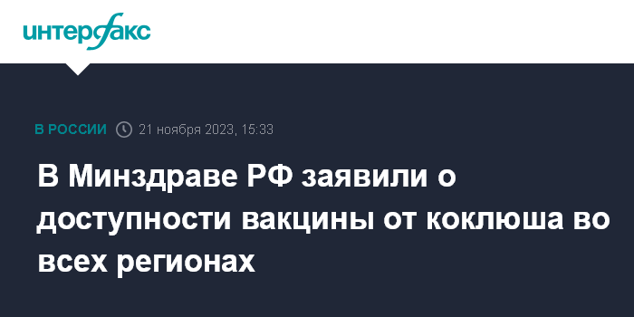 Москва. 21 ноября. INTERFAX.RU - Препараты для вакцинации от коклюша доступны во всех регионах России; их остатки составляют более 3,7 млн доз, сообщили "Интерфаксу" в Минздраве России.