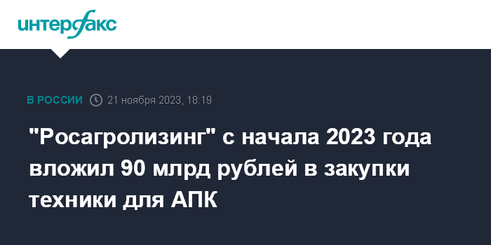 Москва. 21 ноября. INTERFAX.RU -"Росагролизинг" с начала 2023 года направил 90 млрд рублей на приобретение техники и оборудования для АПК, сообщил глава компании Павел Косов на сельскохозяйственной выставке "Югагро" в Краснодаре.