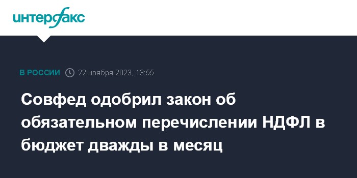 Согласно действующему законодательству, налоговые агенты обязаны перечислять НДФЛ один раз в месяц - за период с 23-го числа предыдущего месяца по 22-е число текущего месяца не позднее 28-го числа текущего месяца. Одобренный сенаторами закон обязывает агентов с 2024 года перечислять НДФЛ в бюджет дважды в месяц: не позднее 28-го числа (за период с 1-го по 22-е число текущего месяца) и не позднее 5-го числа (за период с 23-го числа предыдущего месяца по последнее число текущего месяца).