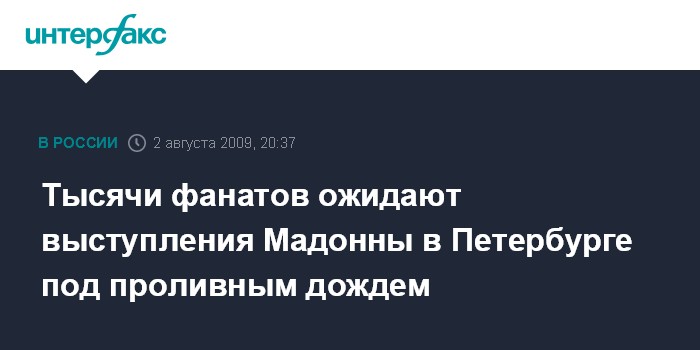 Санкт-Петербург. 2 августа. ИНТЕРФАКС-СЕВЕРО-ЗАПАД - Несколько десятков тысяч фанатов ожидают выхода Мадонны на сцену на Дворцовой площади Петербурга под проливным дождем, передает с места событий корреспондент "Интерфакса".