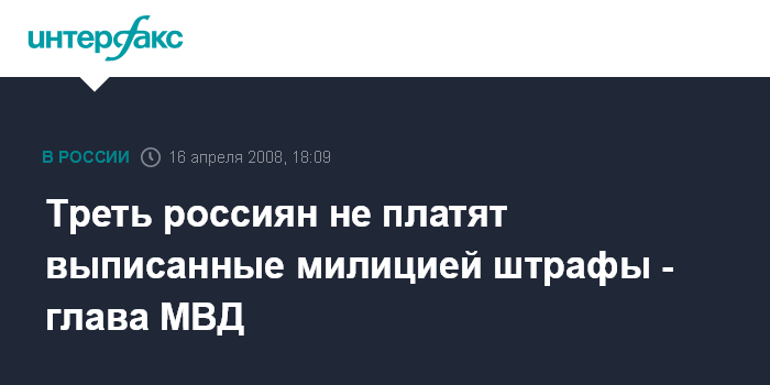 Москва. 16 апреля. INTERFAX.RU - Каждый третий россиянин, которому сотрудники милиции выписывают административный штраф, не выполняет свою обязанность и игнорирует эти штрафы, заявил министр внутренних дел России Рашид Нургалиев, выступая в среду в Совете Федерации.