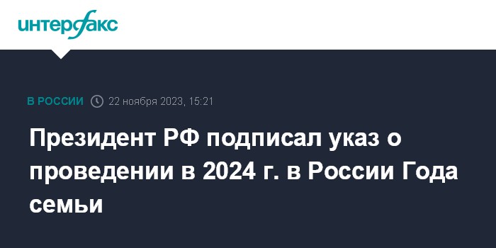 Москва. 22 ноября. INTERFAX.RU - Президент РФ Владимир Путин подписал указ о проведении в 2024 году в России Года семьи.